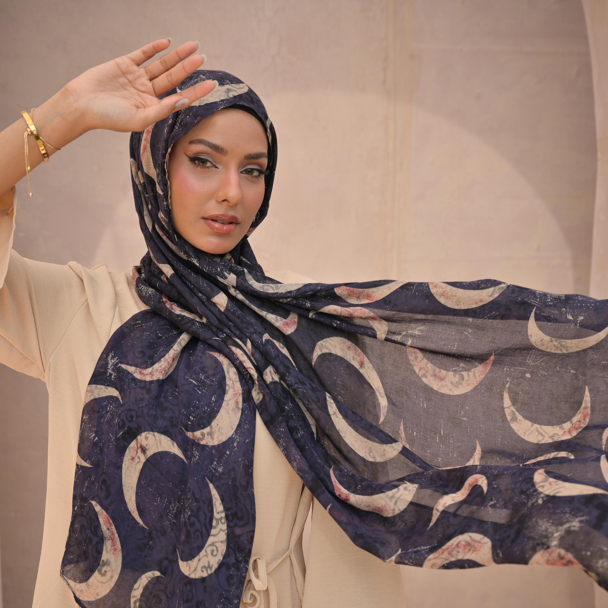 Each scarf represents a feeling—patience during long days, gratitude at iftar, stillness during late-night prayers, and the quiet intention to do better than the year before. The designs are rooted in Islamic architecture and calligraphy, not as decoration, but as meaning—patterns that have lived with us for generations, now worn in a modern way.